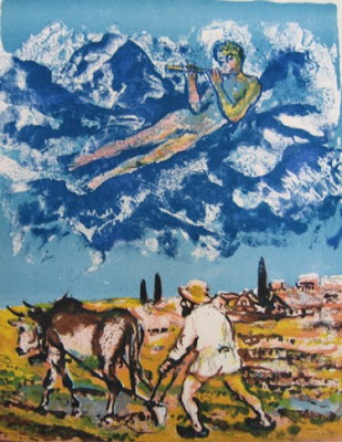 There's definitely a kinship with Chagall (you can see it in the ploughing picture, too). When Spitzer heard news of Chagall's death, he was working on a large canvas Let My People Go, showing a whole village of Jews leaving their shtetl, clutching their most precious possessions, bound for Israel. As a tribute, Spitzer painted a young Chagall into the picture, holding his brush and palette.
