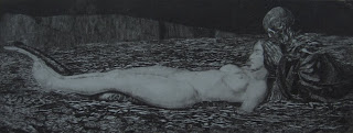 Rudolf Jettmar (1869-1939) was born in Zawodzie, and died in Vienna. He studied at the academies in Vienna and Karlsruhe, therefore coming under the influence of teachers such as William Unger and Leopold von Kalckreuth. Rudolf Jettmar was a member of the Vienna Secession from 1898. The luxurious decadence of my etching by Jettmar (which comes from the series Stunden der Nacht) reminds me of the work of Alois Kolb, and I wouldn’t be surprised to discover some connection between the two; perhaps, though, it is simply case of shared influences.