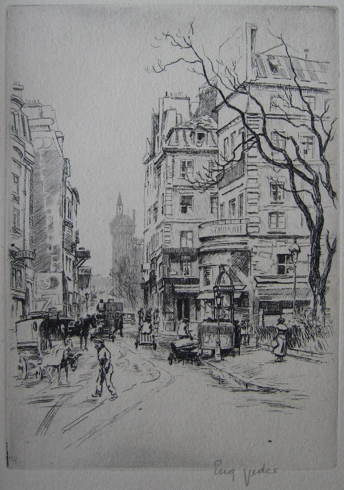Perhaps not surprisingly, the only writing of any substance I have found about Véder is in Byblis, accompanying his etching of La rue Saint-Denis. It is an essay by Robert Vernand, entitled "Eugène Veder, Parisien" (Burnand never gives Véder the acute accent). He writes: Tous les jours, j'imagine, Veder quitte son atelier de la Montagne Saint-Geneviève, cette petite place de l'Estrapade qui, malgré son nom redoutable, dort à l'ombre de paisibles catalpas. Il s'en va, son carton sous les bras, ou sa boîte d'aquarelle. Il muse le nez en l'air, descend la rue Mouffetard, bavarde avec les commères, marchande des fruits aux baladeuses et, si besoin est, boit un verre sur le zinc. Et son oeil note et son crayon enregistre; il dessine et il peint dans un coin, installé vaille que vaille. "Every day, I guess, Véder leaves his studio in the Montagne Saint-Genevieve, in the little place de l'Estrapade which, despite its formidable name, sleeps in the shade of tranquil catalpa trees. He sorties out with his portfolio under his arms, or his box of watercolors. He dawdles, nose in the air, down the Rue Mouffetard, chats with the gossips, from the fruit sellers to the idlers, and, if necessary, pops in for a drink at the bar. And his eye notes and his pencil and records, and he paints in a corner, installed any old how."