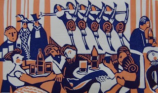 There is no way of knowing which hand cut which line, and the linocuts must be credited as joint productions of Flight and Lawrence; this method of joint creation was also employed by two other notable linocut artists of the Grosvenor School, Sybil Andrews and Cyril Power, working as Andrew-Power. I love the sly, quirky humour of these vibrant linocuts, which show both Claude Flight's sureness of line, and the ready wit with which Edith Lawrence was able to respond in a moment to the challenge, "Say something, Edith."