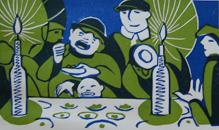 Born in 1881, Walter Claude Flight was the most influential figure in the development of the colour linocut as a key element of the Modernist aesthetic. Influenced by the Futurists, Flight embraced the linocut as a truly democratic art form, and one that was capable of expressing the power, energy, and expressive movement of the Machine Age. Flight was a cousin of the writer Rudyard Kipling. He had tried various careers - including engineering and beekeeping - before he entered Heatherley's School of Fine Art in 1913. Although his time at Heatherley's was cut short by the outbreak of WWI, the relationships he forged there were crucial to the development of Flight's art. One notable fellow-student was C. R. W. Nevinson, who introducted Flight to the work of the Futurists. Flight married a fellow-student, Clare James, in 1915. This marriage produced two daughters, but did not last. From 1922 until his death, his companion was a fellow linocut artist, and textile designer, Edith Lawrence (1890-1973). Flight and Lawrence shared an exhbiition of textiles and linocuts at the Redfern Gallery in 1928. All of my linocuts by Claude Flight come from the book Christmas and other Feasts and Festivals: A Picture Commentary for Grown-Ups, published by George Routledge in 1936. The book is credited to Claude Flight (who is the author of the brief introduction), but the 45 two-colour linocuts that follow are "Printed from Linoleum Blocks cut by Claude Flight and Edith Lawrence". The printer was Headley Brothers; the cuts are printed on both sides of the paper, back-to-back.