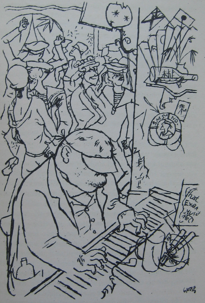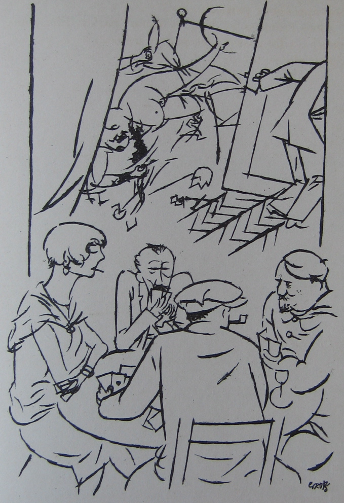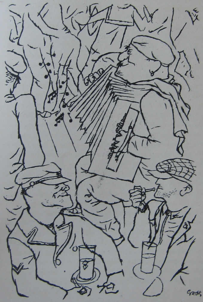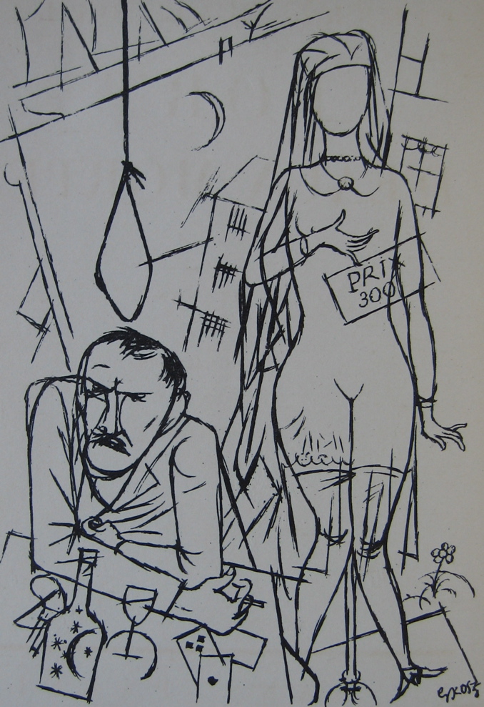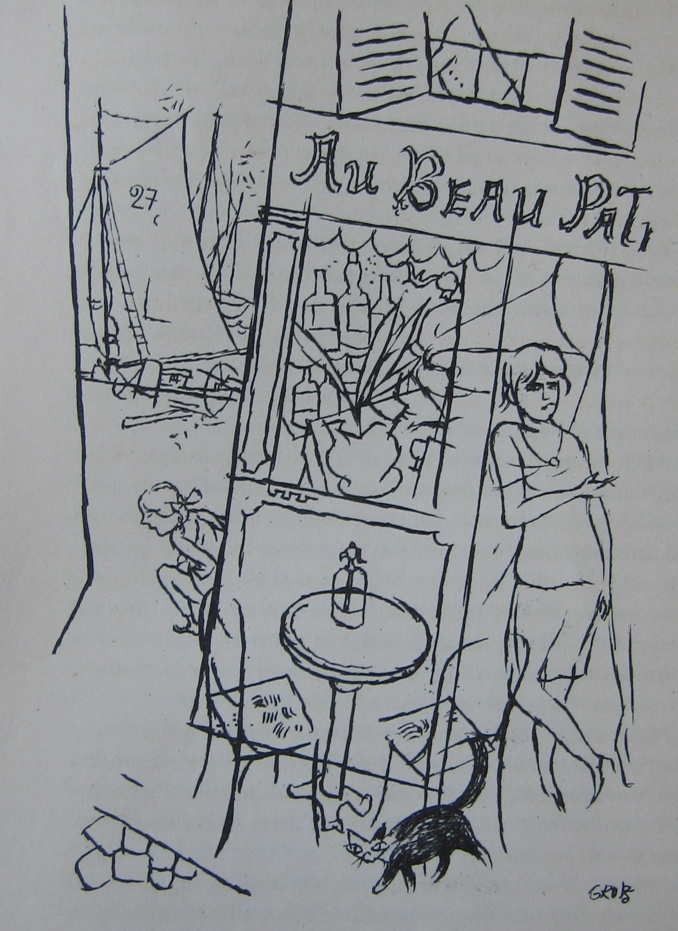 George Grosz (1893-1959) is best remembered for his violent satirical drawings of the decadent Berlin of the 1920s, which depict a corrupt world of leering businessmen pawing at prostitutes. These drawings were collected and reproduced in publications such as Ecce Homo (1923). Ecce Homo was seized by the Public Prosecutor, and in February 1924 Grosz was tried for obscenity and fined 6,000 marks. It was perhaps this that prompted an extended trip to France, for the whole of April and May of 1924, resulting in his first French exhibition in that November, and a further extended spell in France from June to October in 1925. Grosz had studied in Paris in 1912 at the Atelier Colarossi, at which time he met likeminded artists such as Moise Kisling and Jules Pascin, and made friends with Bohemian figures such as the writer Pierre Mac Orlan. It was to Mac Orlan that Grosz turned for guidance to the new post-war Paris. As Hans Hess writes in his excellent biography George Grosz, "In April 1924 Grosz travelled to Paris for the first time since the war. With his old friend, Pierre Mac Orlan, he visited Pascin, and with Francis Carco and Man Ray, explored 'Montmartre at night', making the typical remark all visitors make that they 'went to those hidden places which no foreigner ever gets to know'." The kind of hidden places Mac Orlan and Carco favoured is made clear in the subjects of Grosz's Paris drawings: the brothel Le petit moulin, another famous maison close in the rue Blondel, or the seedy Bar du Dingo, full of pimps and their girls.