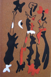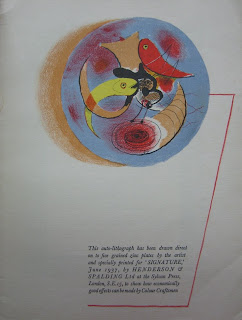 The answer is a stencilled intepretation of an untitled painting by Joan Miró. It is printed on this extraordinary sandpaper support because that is what Miró himself had used for the original. The artist responsible for the stencil was John Piper. Piper recalls this episode in "Working with Printers", written in 1987 for Orde Levinson's catalogue raisonné, "Quality and Experiment": The Prints of John Piper. Remembering Curwen's support for the avant-garde journal Axis: A Quarterly Review of Contemporary Painting and Sculpture, which was edited by Piper's wife-to-be Myfanwy Evans and published by A. Zwemmer, Piper writes, "He even encouraged me to reproduce a Miró which had been painted on glass paper, on real glass paper, and bound it into Signature." It appeared in Signature 7 in 1937.