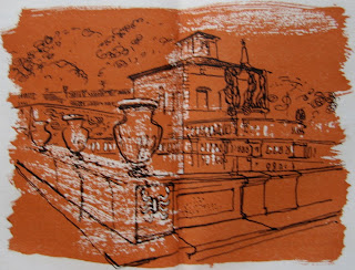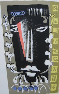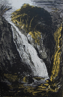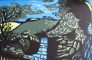 Regarding the Paramat blocks used to create the image, Piper writes, "They consisted of a thin sheet of aluminium mounted by a thin sheet of rubber composition which could be cut away with a model maker's knife to leave the area required in relief which could then be inked and printed... It was a poor man's parallel to the French 'pochoir' process, all hand done, involving girls with stencils and which produced beautiful results in pricey art books in Paris." As Piper, notes, this technique was also used at Curwen; in fact Harold Curwen improved the pochoir process, which had been brought to a pitch of near-perfection by Jean Saudé, by replacing metal stencils with transparent plastic ones, so that the "girls with stencils" could see what they were doing when they hand-applied the colour.