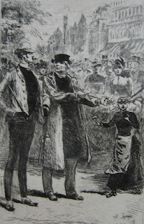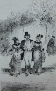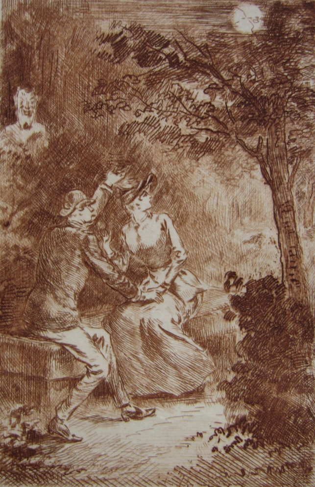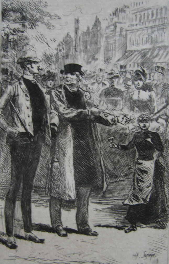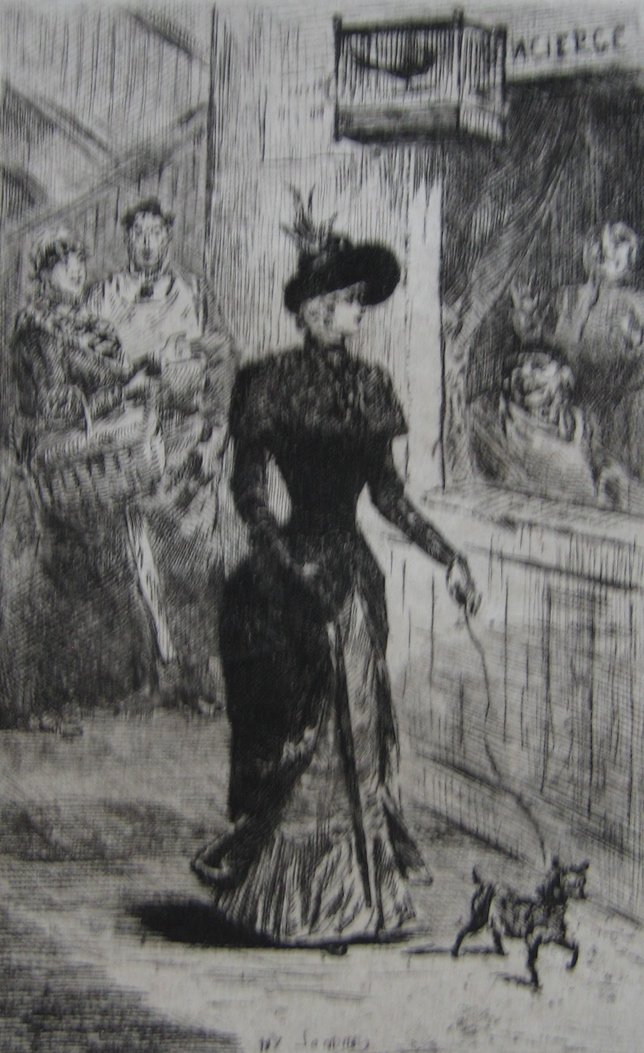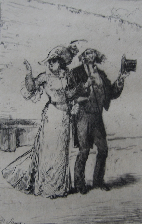 A socially-aware side to Henry Somm emerges in his etchings for three works by Auguste Saulière: Les leçons conjugales (1879), Histoires conjugales (1881), and Ce qu’on n’ose pas dire (1884). In these works, the gaiety of Somm’s humour is tempered by a strong sense of inequality and tension between the sexes. A deceitful lover promises the moon to a naive poor girl; an elegantly dressed young woman is despatched to walk the streets; the viewer is invited to “allez dans les cafés et sur les boulevards” to witness the reality of child prostitution. Elizabeth K. Menon discerns in Somm’s work a fear of women as potentially dangerous and manipulative, but in these etchings his fear is predominately for the female characters, not of them.