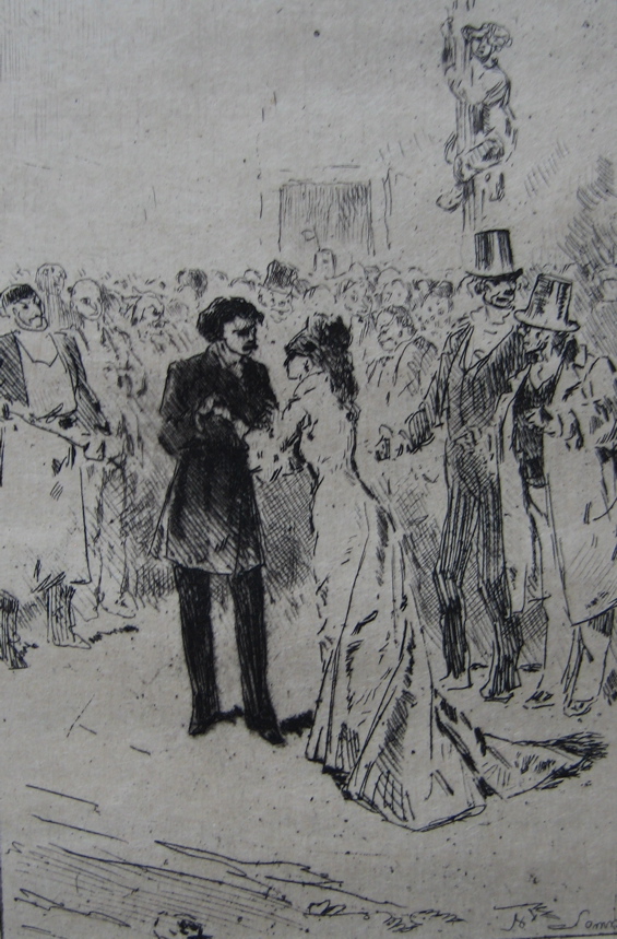 Henry Somm’s appearance as a contributor to Paris à l’eau-forte comes as no surprise. Both of the art editors of this short-lived journal (1873-1876), Frédéric Regamey and his successor Henri Guérard, were passionate Japonistes, and so was Henry Somm. Another article by Elizabeth K. Menon, The Functional Print in Commercial Culture: Henry Somm’s Women in the Marketplace (available in full here) explores Somm’s Japonisme. At the urging of Siegfried Bing and Philippe Burty, Somm enrolled in Léon de Rosny’s courses in Japanese language and history at the University of Paris. After two years of study, Somm intended to travel to Japan in 1870, funded by the French State, but his plans were derailed by the Franco-Prussian war. He remained in Paris, and his Japan remained very much a country of the imagination rather than an experienced reality. Japanese objects and figures feature in some of Somm’s prints, such as the 1881 etching entitled Japonisme, but the actual Japanese influence on his art is quite subtle and hard to define. Elizabeth K. Menon locates it in the Japanese tradition of mitate, or parody, a method in which a satiricial or humorous point is made by “an amusing juxtaposition of two unlike ideas”. Her argument is quite complex, and I urge you to read it in full. Elizabeth K. Menon (now Elizabeth K. Mix) appears to be the only scholar to have made a serious study of Henry Somm, and has also published Henry Somm: Impressionist, Japoniste or Symbolist? in Master Drawings 33, no. 1 (Spring, 1995).