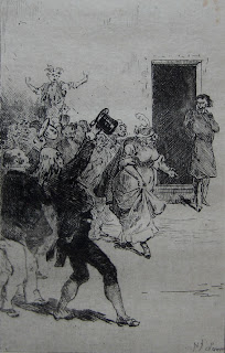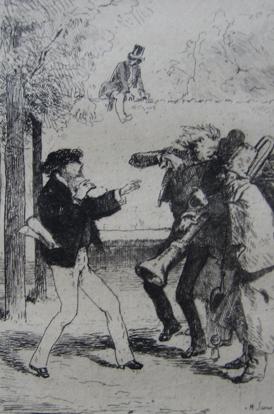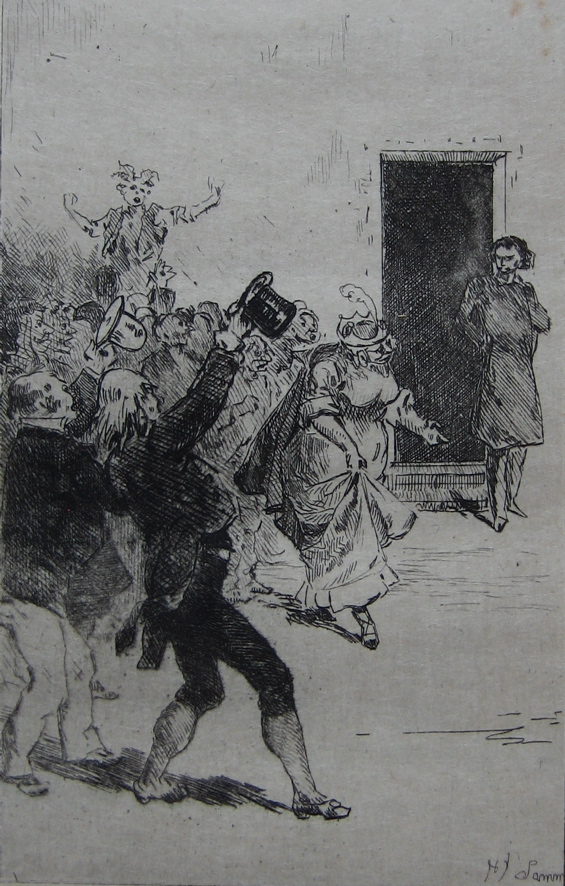 As the friendship with Toulouse-Lautrec indicates, Henry Somm was very much part of the nightlife of Montmartre, most particularly through his involvement in the nightclub Le Chat Noir. In 1885 Somm and George Auriol set up the famous théâtre d’ombres in Le Chat Noir. Although the most famous creator of shadow-plays for this raffish venue was Henri Rivière, the first production was Somm’s L’Éléphant. This play, and others such as La Berline de l’émigré and Cythère à Montmartre , are now regarded as important precursors of Alfred Jarry’s Ubu plays, and by extension of the entire Theatre of the Absurd. The connections between Somm and Jarry have been explored in an essay by art historian Elizabeth K. Menon with the wonderful title Potty-talk in Parisian Plays. I’ve only been able to find scraps of this on the net, so don’t know if Menon takes the story further back to the absurdist playlet La Maison de fous by Richard Lesclide, which Somm illustrated with etchings in 1876. These appeared both in a book and in the journal Paris à l’eau-forte, which was edited by Lesclide. This play and others by Lesclide such as La Diligence de Lyon, which is famously based on an unresolved dirty joke, also anticipate the theatre of the absurd.