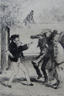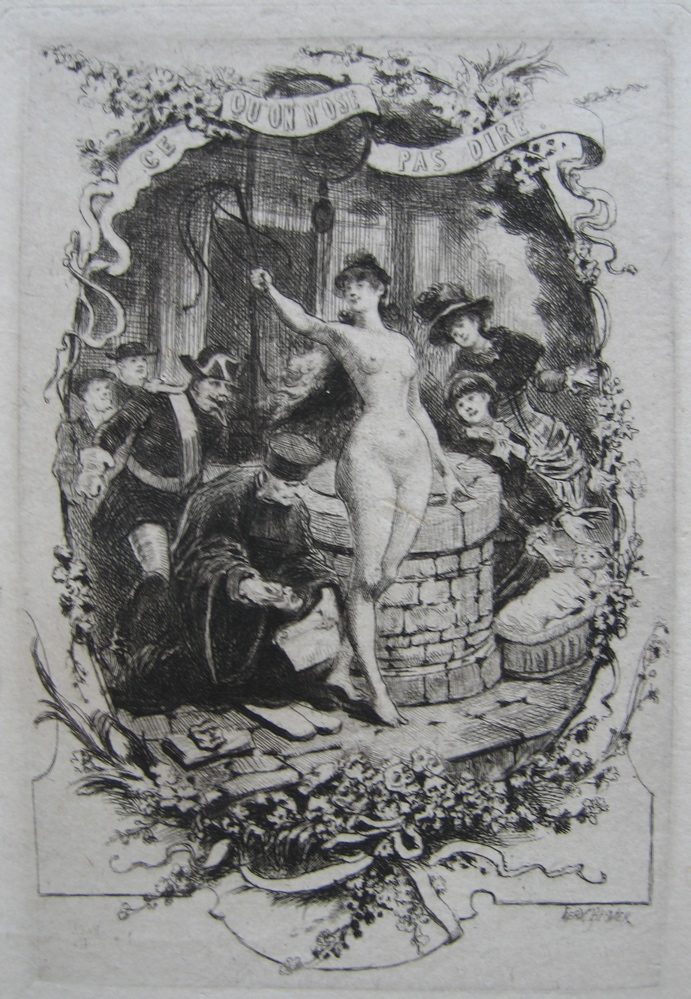 Much of Henry Somm’s work has become very scarce. Journals that were issued in runs of thousands become hard to find very quickly, while items such as menus, invitations, programmes, ex libris and cartes-de-visite, all of which Somm decorated with etched vignettes, are the very definition of ephemera. His individual plates seem to have been issued in very small numbers, and the books too were always limited. La rapinéide was published by Barraud in an edition of 500 copies on various papers, printed by Jules Bonaventure. Les leçons conjugales was a “tirage à petit nombre” on wove paper, with 100 copies on laid paper with the etchings avant la lettre on Japon, and 50 copies on Chine with the etchings avant la lettre. I also have 3 of the etchings for this as published in Paris à l’eau-forte in 1876; it may be that Richard Lesclide intended to publish this book himself from his associated press, Librairie de l’eau-forte, but his business failed, he took the post of secretary to Victor Hugo, and Les leçons conjugales was published three years later by E. Dentu. The same publisher issued Histoires conjugales and Ce qu’on n’ose pas dire, in the same print-runs, except for the latter he added 20 copies on Japon. My copy of Ce qu’on n’ose pas dire has an extra set of the etchings without letters, all printed in black on Chine except for one in sanguine on Japon; the copy itself is one of the ordinary ones on vélin teinté, suggesting that possibly purchasers could add on a suite of the etchings if they so desired. My copy of Les leçons conjugales, incidentally, came from the Bibliothèque du 22me d’Infanterie, and bears their collection stamp on every plate, which I rather cherish, though I guess not everyone would like it. The etchings in all 3 books (and in Paris à l’eau-forte) were printed by Delâtre.