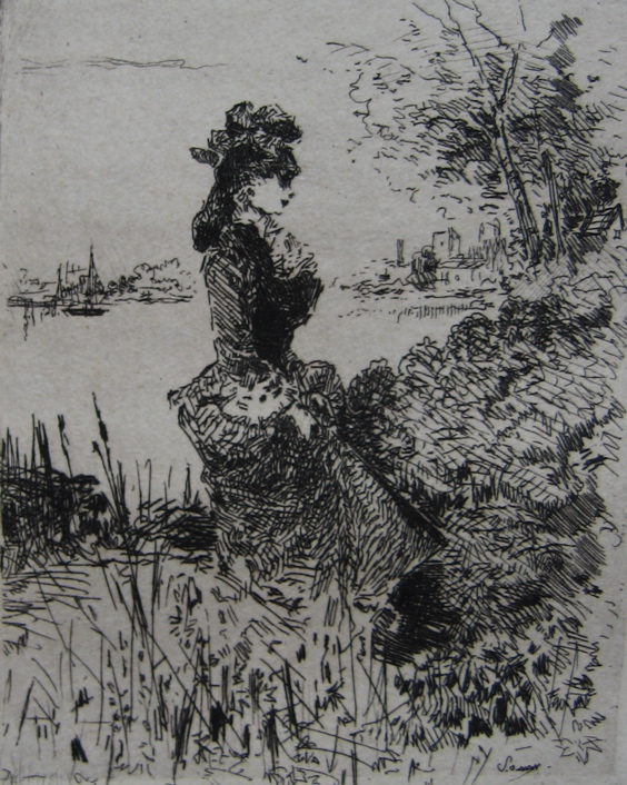 Before coming to Paris, Henry Somm studied at the École de Dessin Municipale in Rouen, under Gustave Morin. Two fellow-students who became his lifelong friends were Alfred Le Petit and Jules Adeline. It seems likely that all three came to Paris together, probably in 1867, and that all three fell under the spell of Japonisme together. Jules Adeline was the first of the three to contribute to Paris à l’eau-forte, presumably through a connection with Frédéric Regamey, but before long Le Petit and Somm were also contributing. I have one plate, Printemps, which, eccentrically, is worked and signed by both Le Petit (who etched the two lovesick frogs in the centre), and Somm, who added drypoint remarques around the edge, including a self-portrait at the easel. This method of surrounding an image with remarques was typical of Félix Buhot, another Japoniste, and was employed by Henry Somm on several occasions.